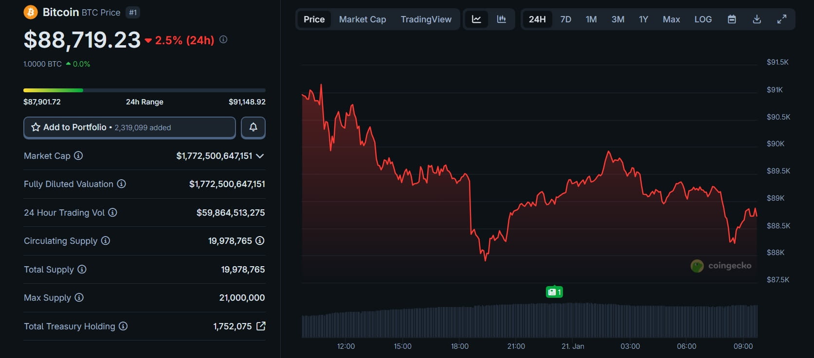 Bitcoin se desplomó momentáneamente por debajo de los 88.000 dólares en medio de tensiones geopolíticas. El mercado está atento a Trump, que se reunirá hoy con líderes mundiales mientras sigue adelante con su campaña para apoderarse de Groenlandia.