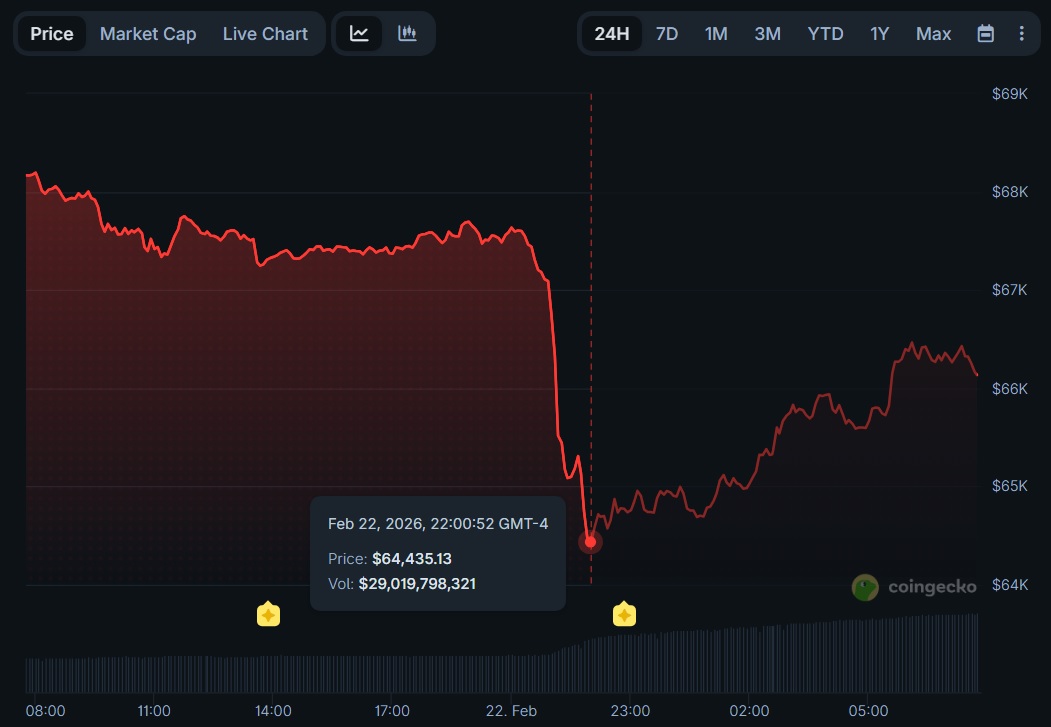 El precio de Bitcoin (BTC) experimentó una fuerte volatilidad durante el fin de semana, descendiendo a un mínimo local de USD $64.435 el domingo por la noche antes de retomar el área de USD $66.000, donde se mantiene este lunes al momento de edición.