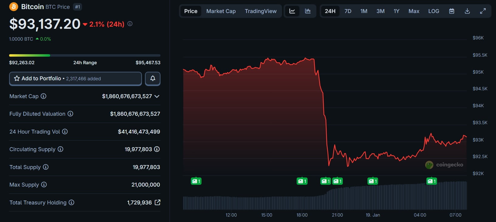 Bitcoin descendió a un mínimo local alrededor de USD $92.200 antes de una modesta recuperación, luego del anuncio de Trump sobre nuevas tarifas a la UE condicionadas a la venta de Groenlandia. El oro subió a un nuevo máximo mientras los activos de riesgo como las criptomonedas se vieron afectados.