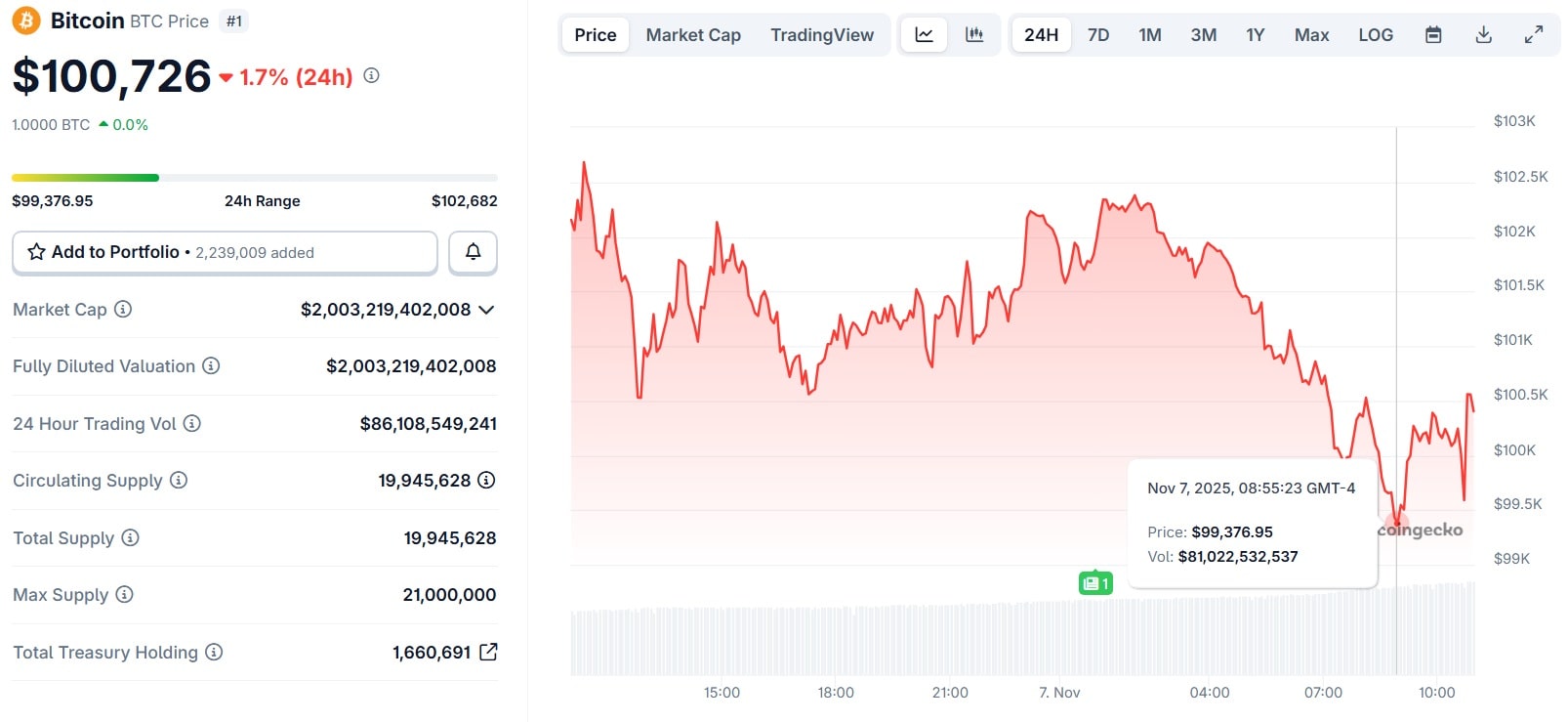 Según datos de CoinGecko, en las últimas 24 horas el precio ha oscilado entre USD $99.376 y $102.682, cotizando cerca de los 100.600 dólares al cierre de esta edición –una baja del 21% desde su máximo reciente de 126.000 dólares conquistado hace un mes.