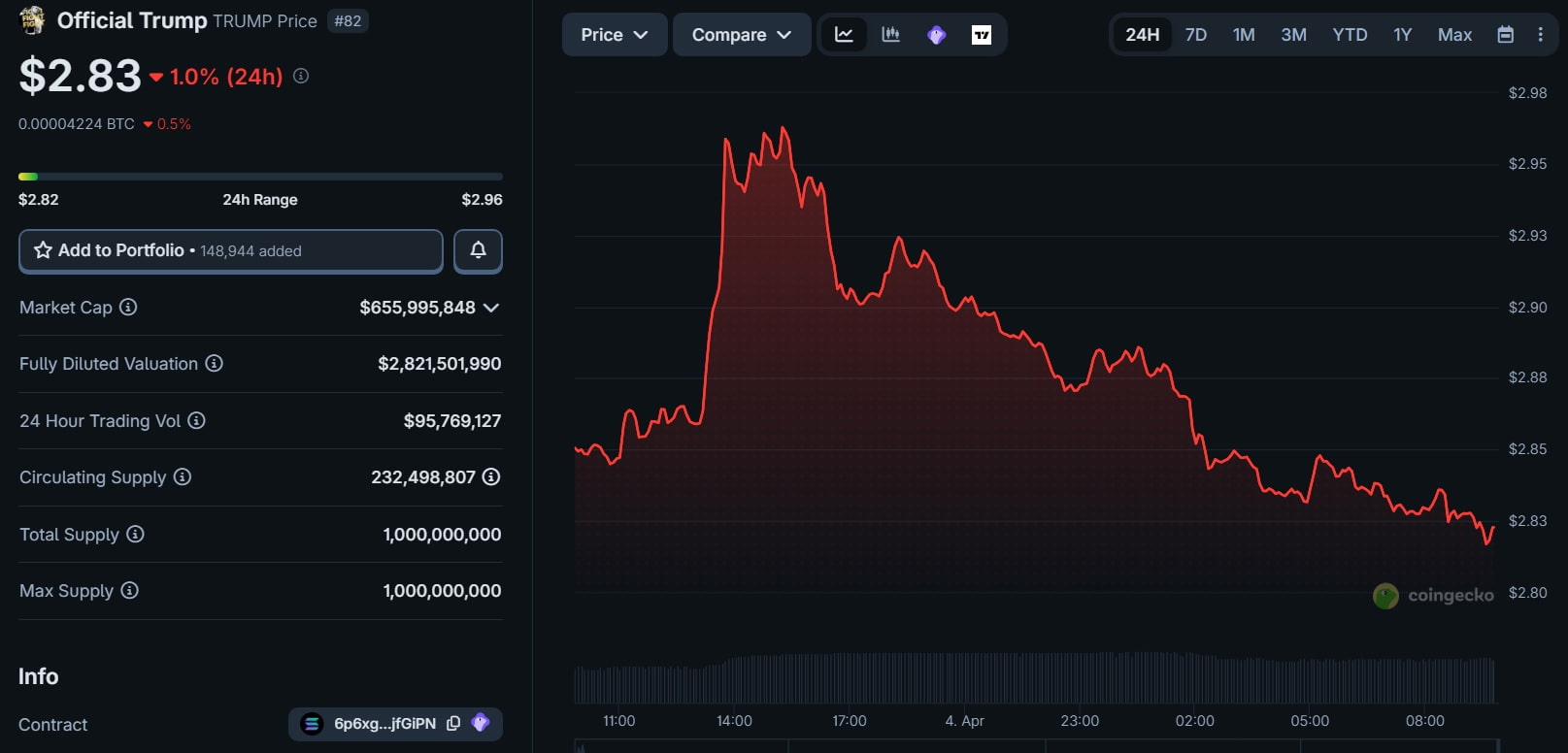 La subida inicial fue de casi 5% inmediatamente después de conocerse la noticia. Más tarde, ya para el domingo, el token retrocedía su avance. Al momento de publicación de este artículo el precio de TRUMP mostraba una caída de 1% en las últimas 24 horas.
